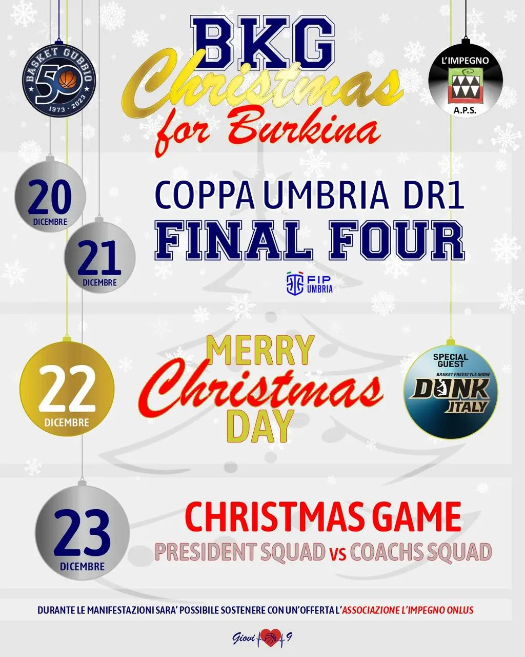 Avranno inizio il 20 dicembre gli eventi natalizi del Basket Gubbio all’insegna della solidarietà, denominati BKG Christmas for Burkina. Eventi i cui proventi saranno interamente devoluti all’associazione L'Impegno A.P.S..
